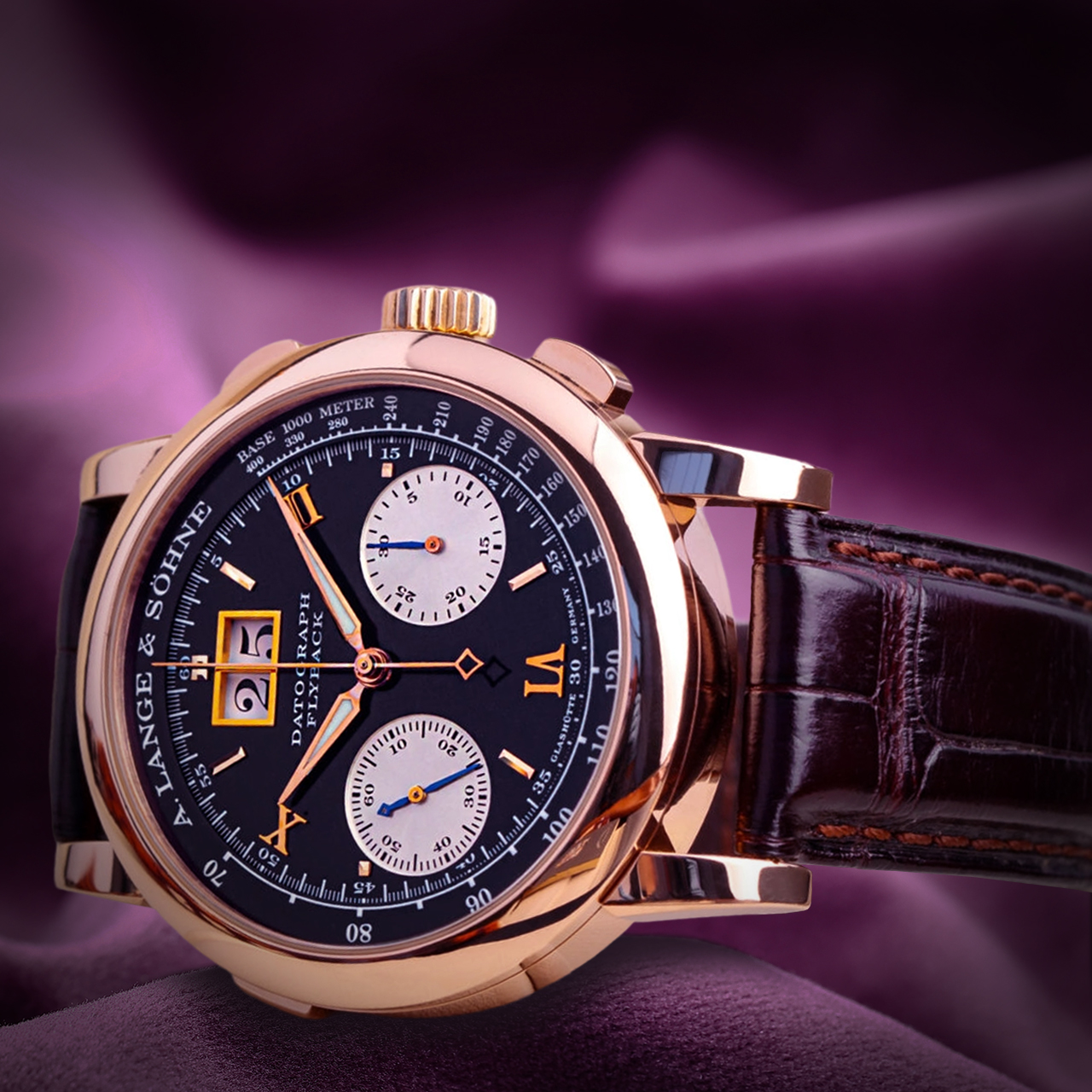 The A. Lange & Söhne 403.031 Saxonia Datograph Flyback luxury watch is an exquisite timepiece that exemplifies German horological artistry. Housed in a 39mm 18k rose gold case, it features a vivid black dial with rose gold applied Roman numerals and stick markers, silver sub-dials, and a prominent double-window big date at the top. Known as the “Dufourgraph”, the 403.031 Datograph is a celebrated manual-wind chronograph with a flyback function, and in-house caliber L951.1 movement with meticulously crafted finishing.