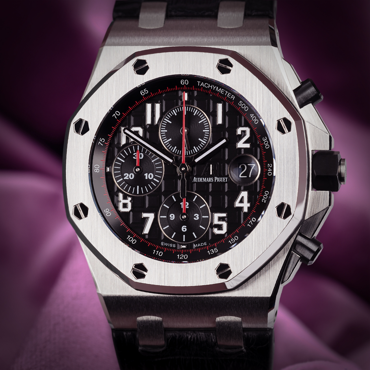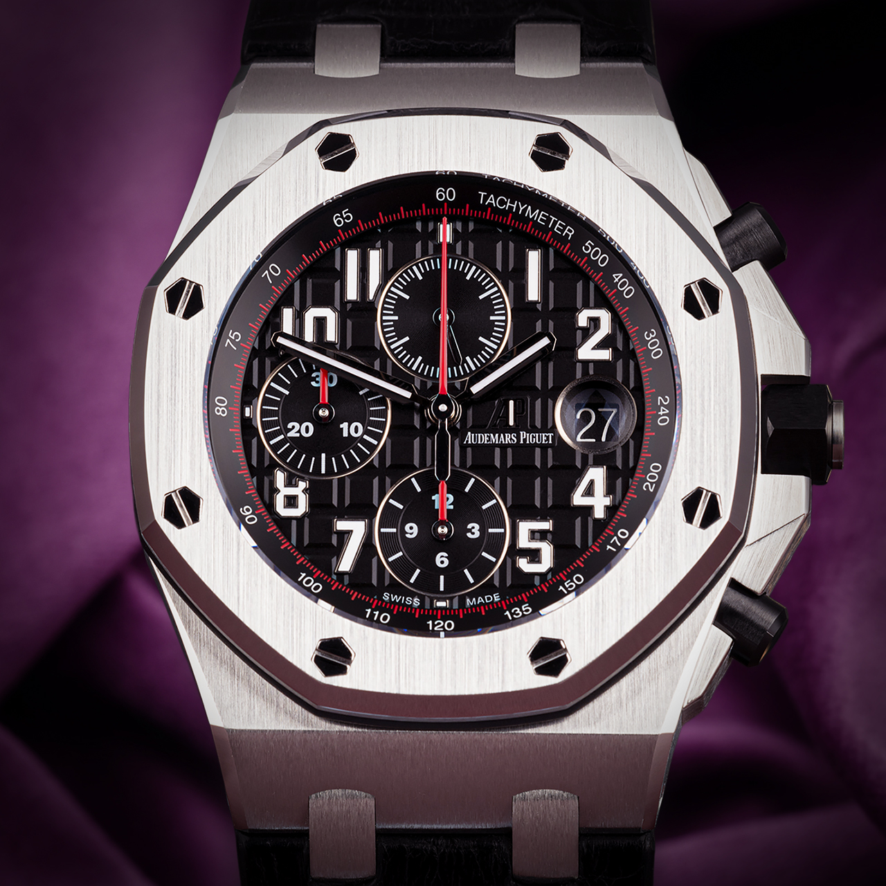 The Audemars Piguet Royal Oak Offshore Chronograph Vampire Black Red 42mm 26470ST.OO.A101CR.01 is a striking and bold timepiece that combines luxury with a sporty edge. Encased in a 42mm stainless steel case, this watch features a deep black dial adorned with the iconic “Mega Tapisserie” pattern, which adds a dynamic texture.