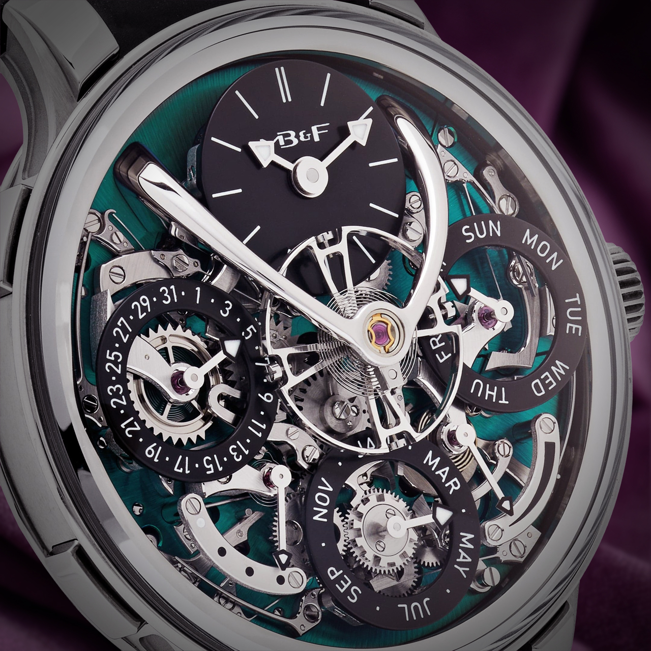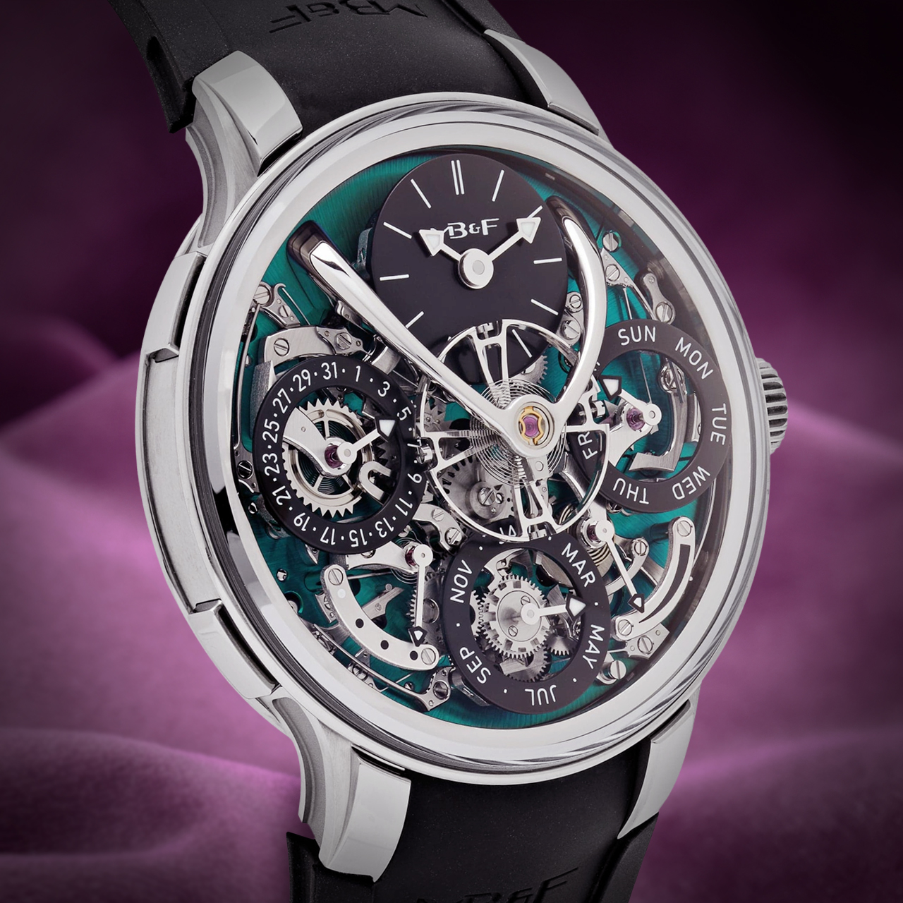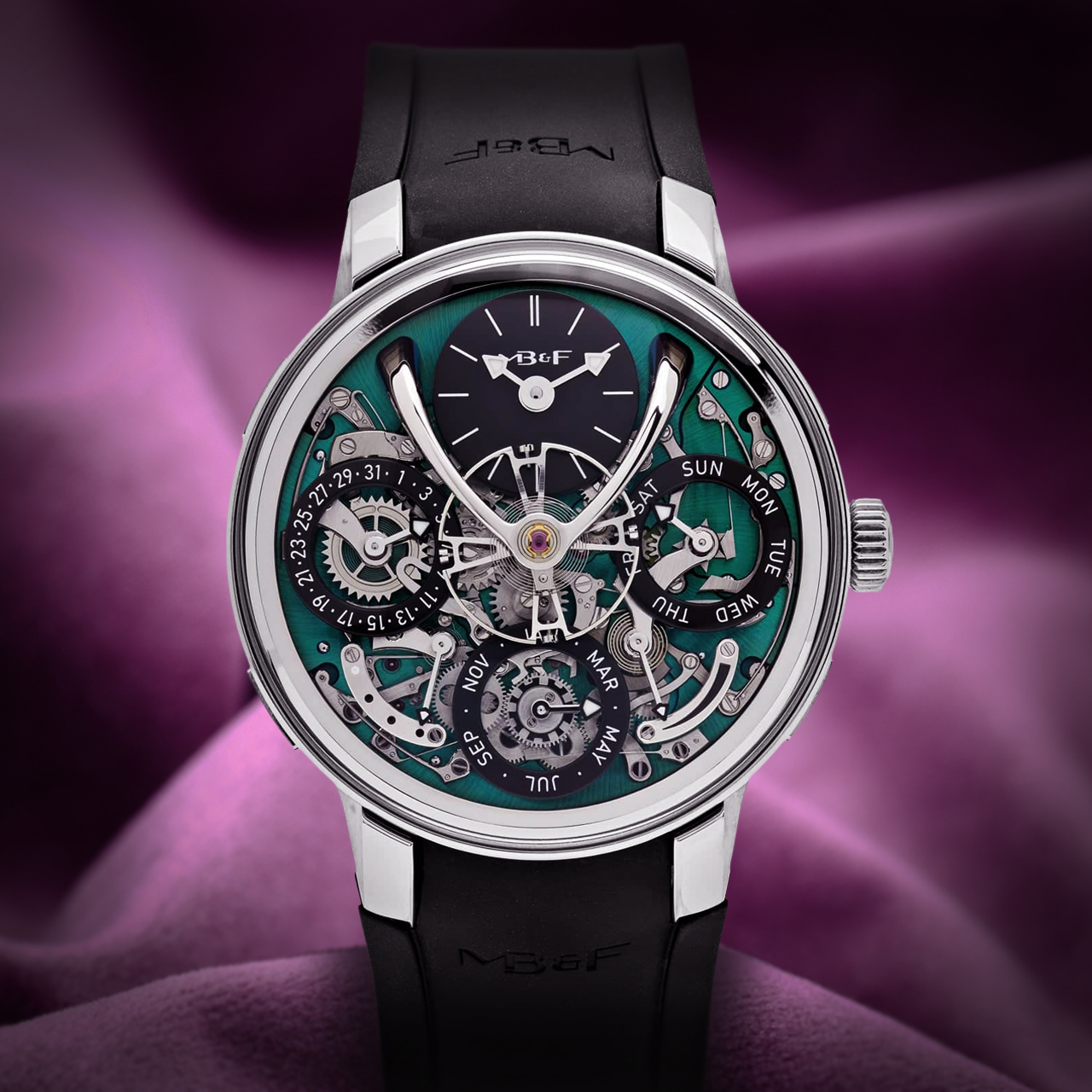 The striking green dial is a highlight, featuring a beautifully textured surface that adds depth and character. The watch showcases a three-dimensional display for the perpetual calendar, with elevated sub-dials for the date, month, and leap year indicator, all orchestrated with a harmonious layout that reflects MB&F’s innovative spirit.