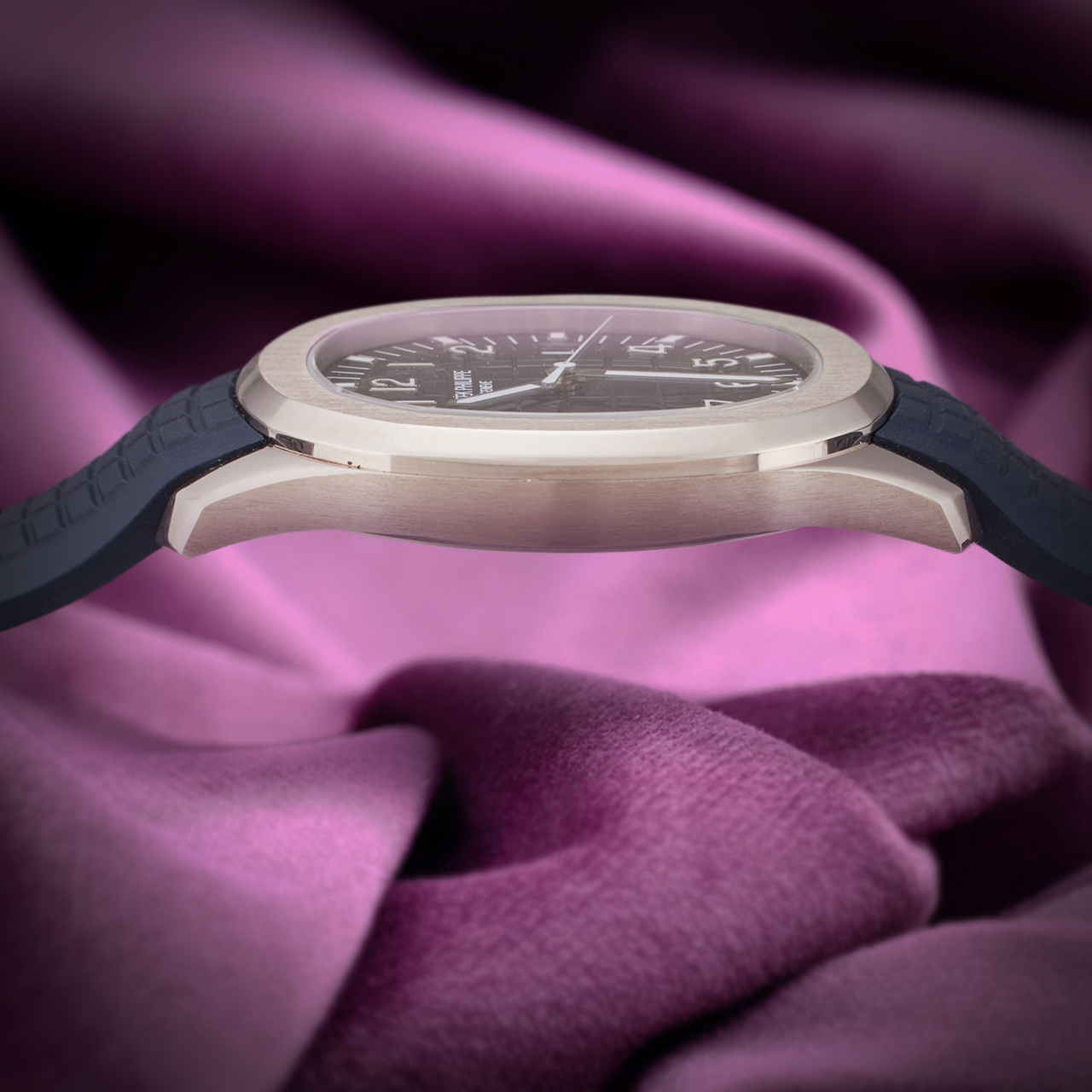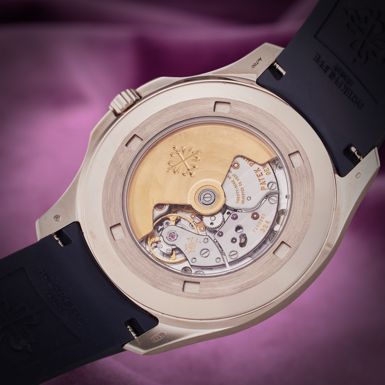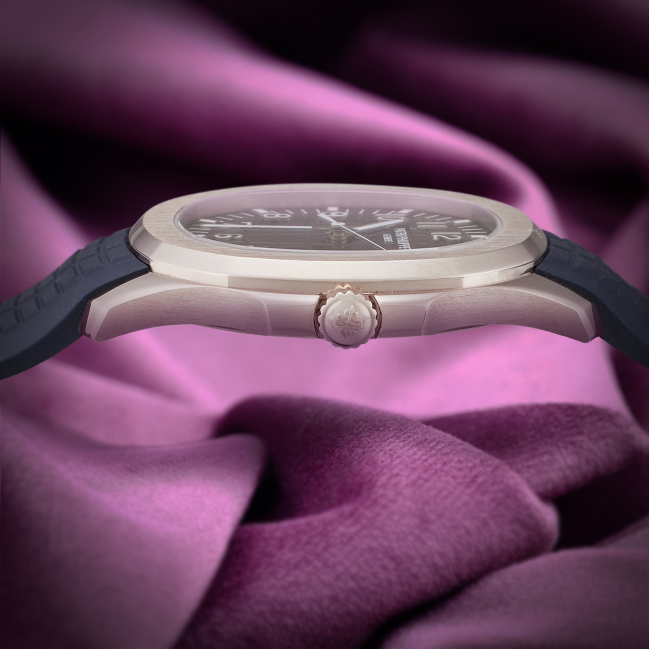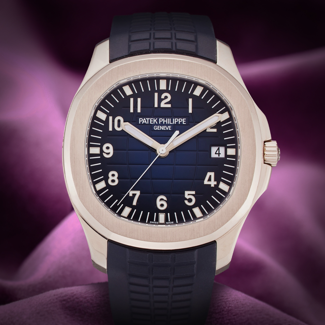 The watch is equipped with a self-winding movement, ensuring precise timekeeping. A date display is conveniently positioned at 3 o’clock for easy reference. Completing its modern design is a durable blue rubber strap, offering both comfort and style, secured with a white gold clasp for a perfect fit. Elevate your collection with the Patek Philippe Aquanaut 5168G-001, where elegance meets functionality in a timeless design. |