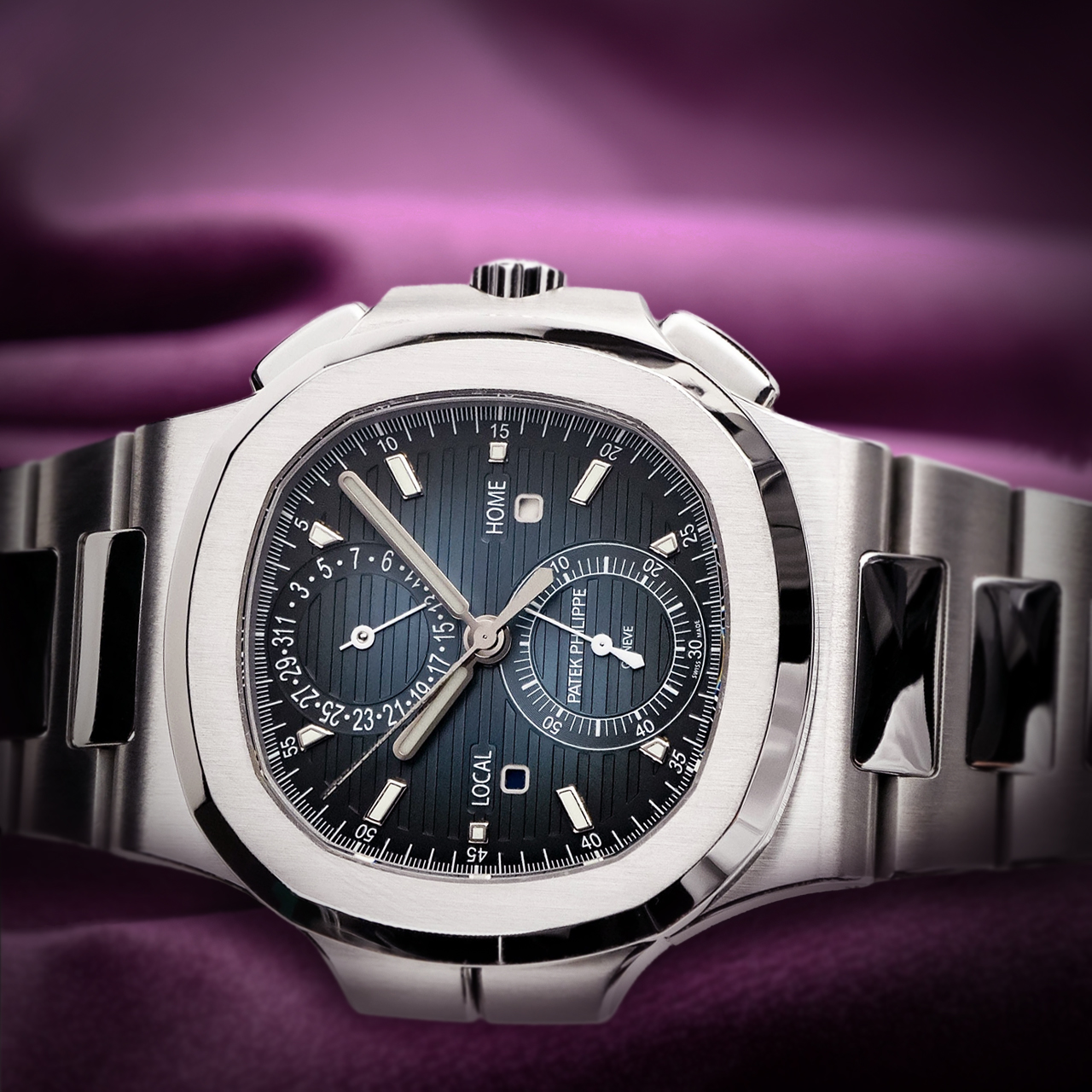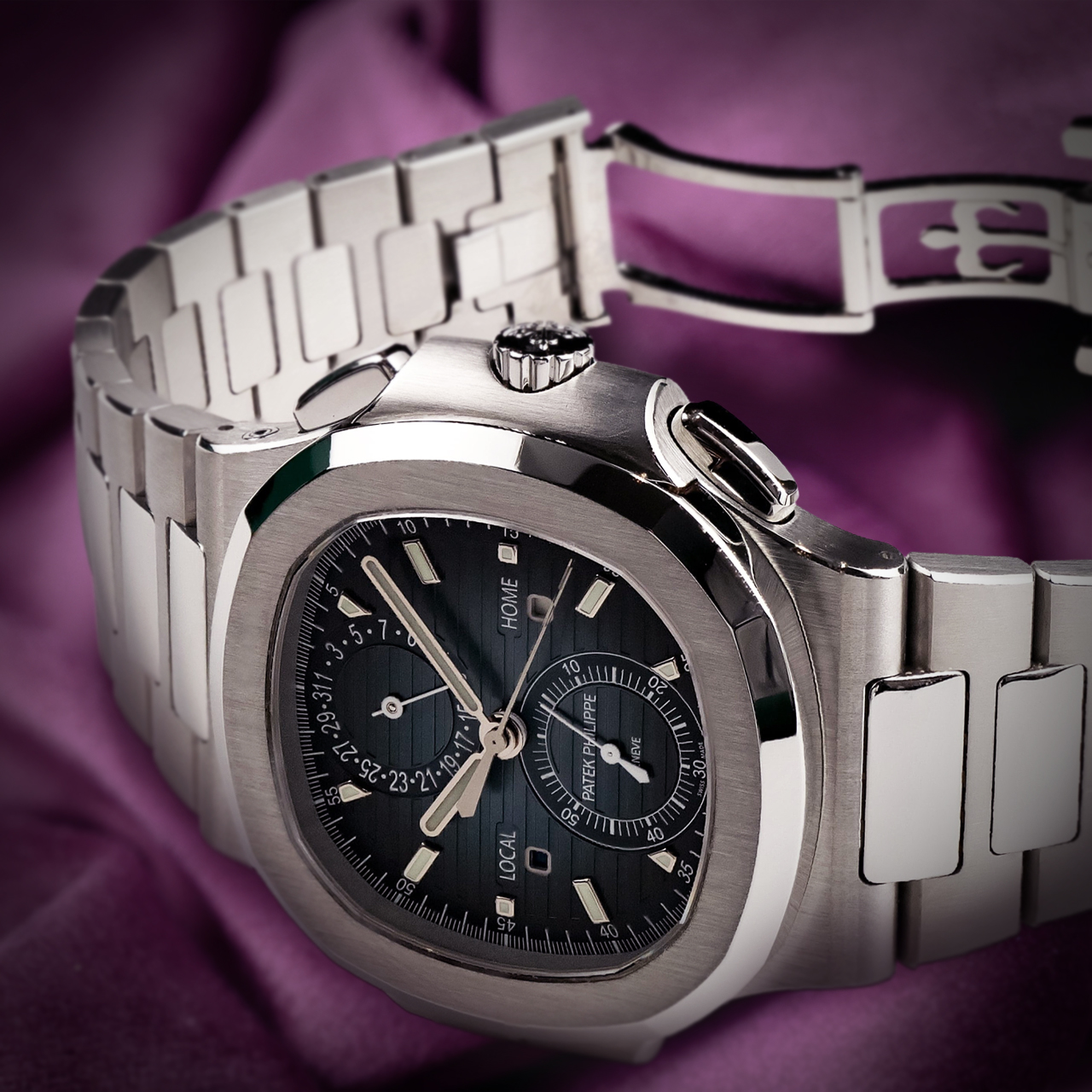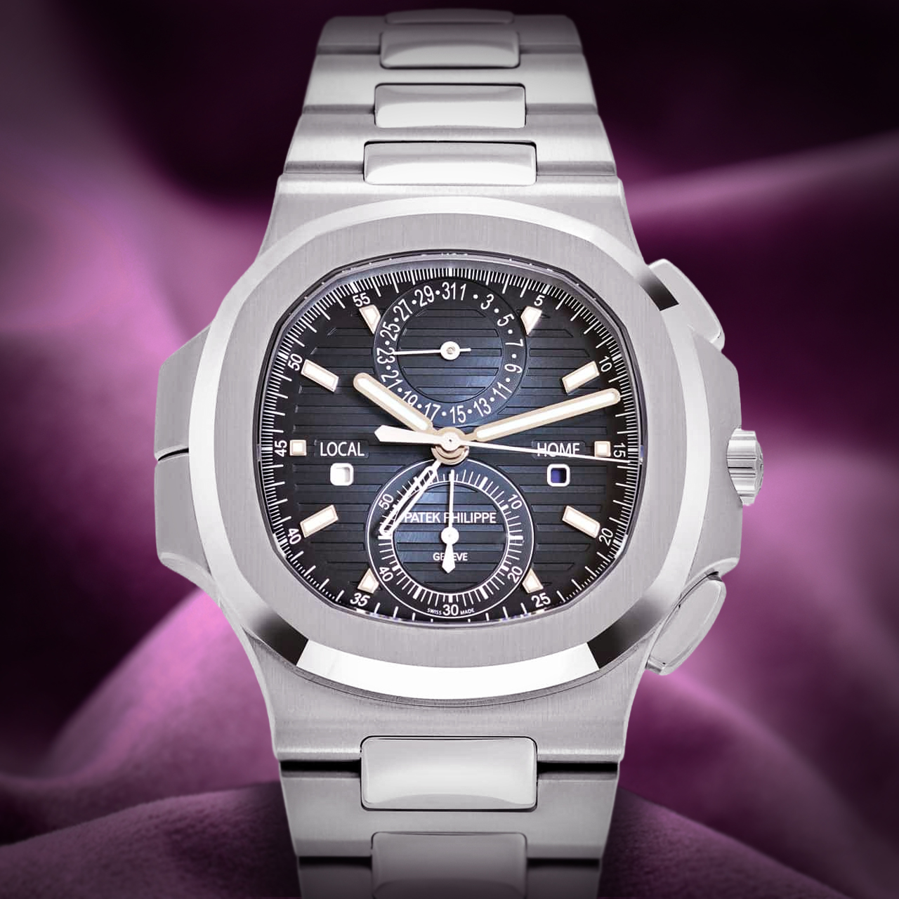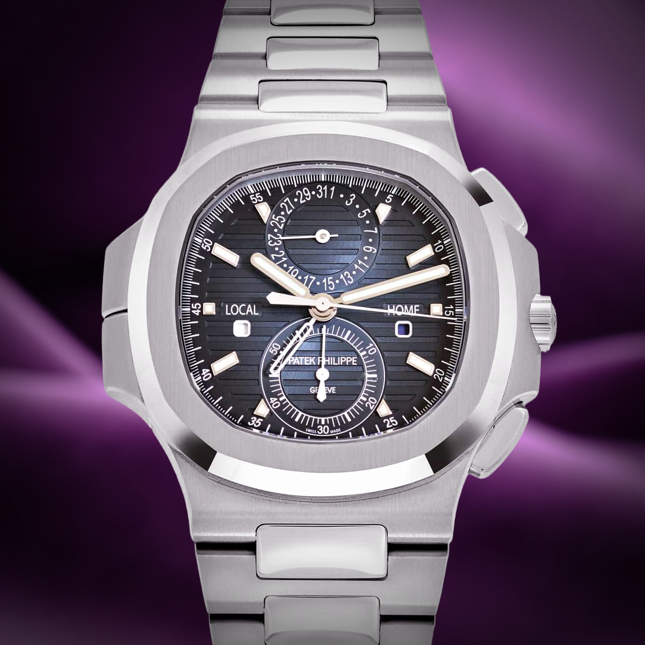 Introducing the Patek Philippe Nautilus 5990/1A-011 ‘Travel Time’ Flyback Chronograph, an exceptional timepiece designed for the modern traveler.