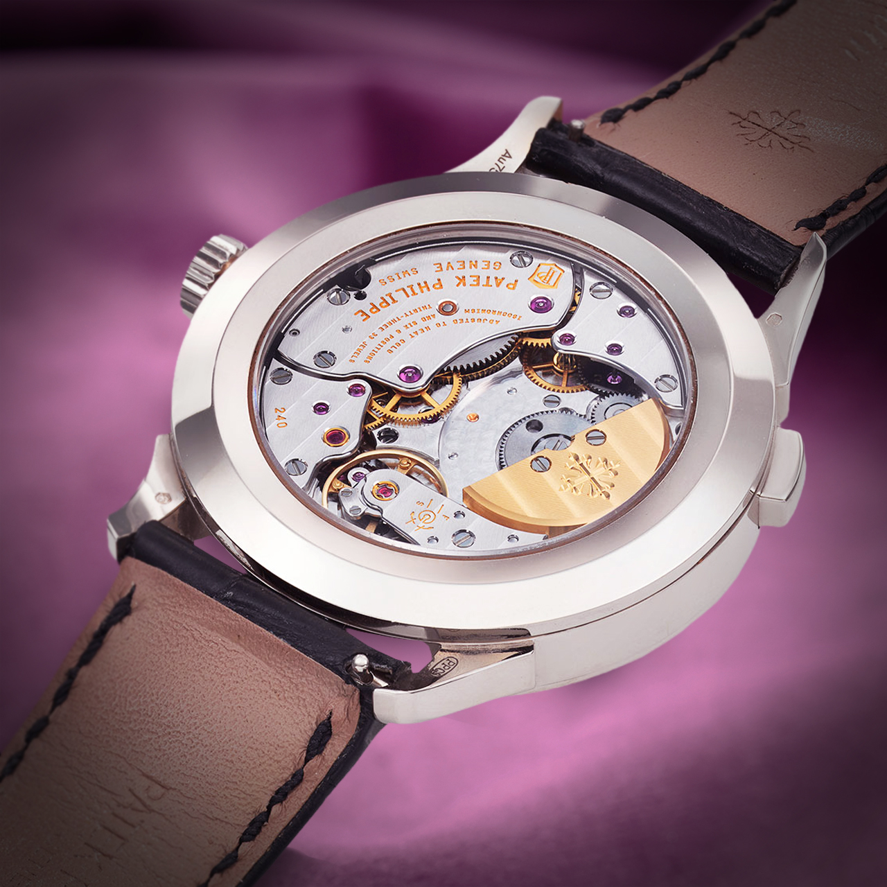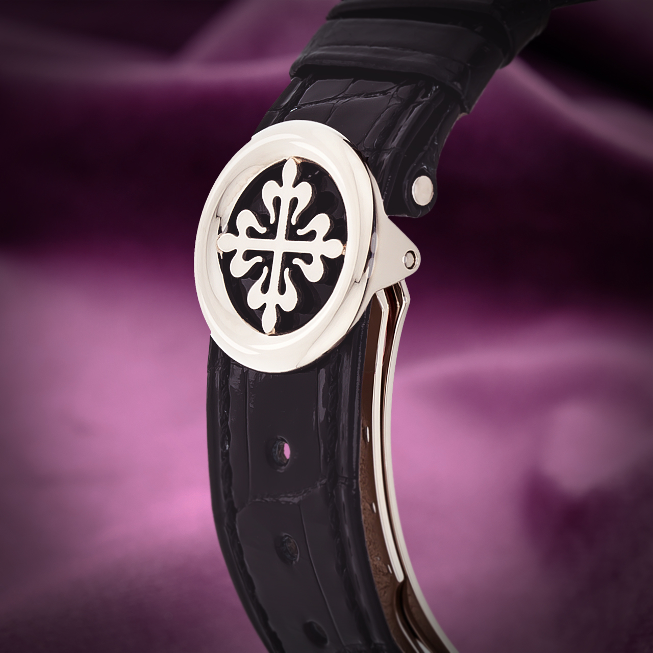 Powered by the Patek Philippe Caliber 240 HU movement, this timepiece ensures precise timekeeping. It is finished with a luxurious blue alligator leather strap and a white gold clasp, combining comfort with a classic aesthetic.