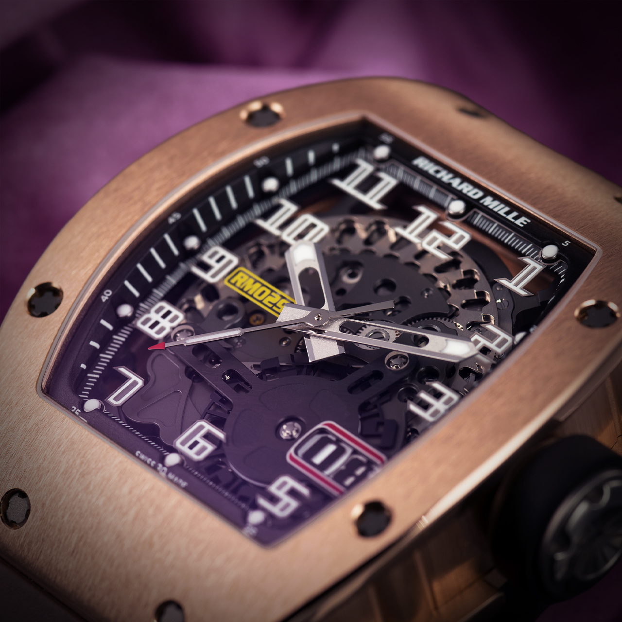 Introducing the Richard Mille RM 029 RG Oversized Date, a luxurious timepiece that combines elegance with cutting-edge technology. This watch features a robust red gold case, exuding warmth and sophistication. The striking skeletonized dial showcases intricate movement mechanics, highlighted by bold hour markers and hands for excellent readability.