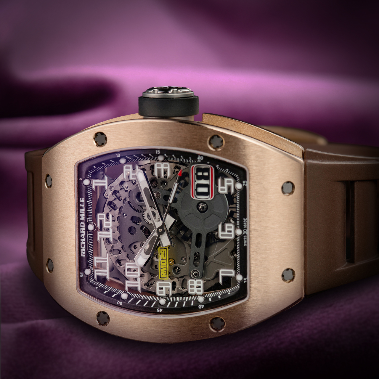 The standout feature is the oversized date display at 5 o’clock, offering a clear view of the date. The watch also includes a small seconds subdial, adding functionality to its refined design. Powered by the RMAS7 automatic movement, it ensures precise timekeeping with a power reserve of approximately 50 hours. The timepiece is completed with a comfortable brown rubber strap, providing a sporty, stylish, and secure fit. Elevate your collection with the Richard Mille RM 029 RG Oversized Date, where exceptional craftsmanship meets modern luxury. |