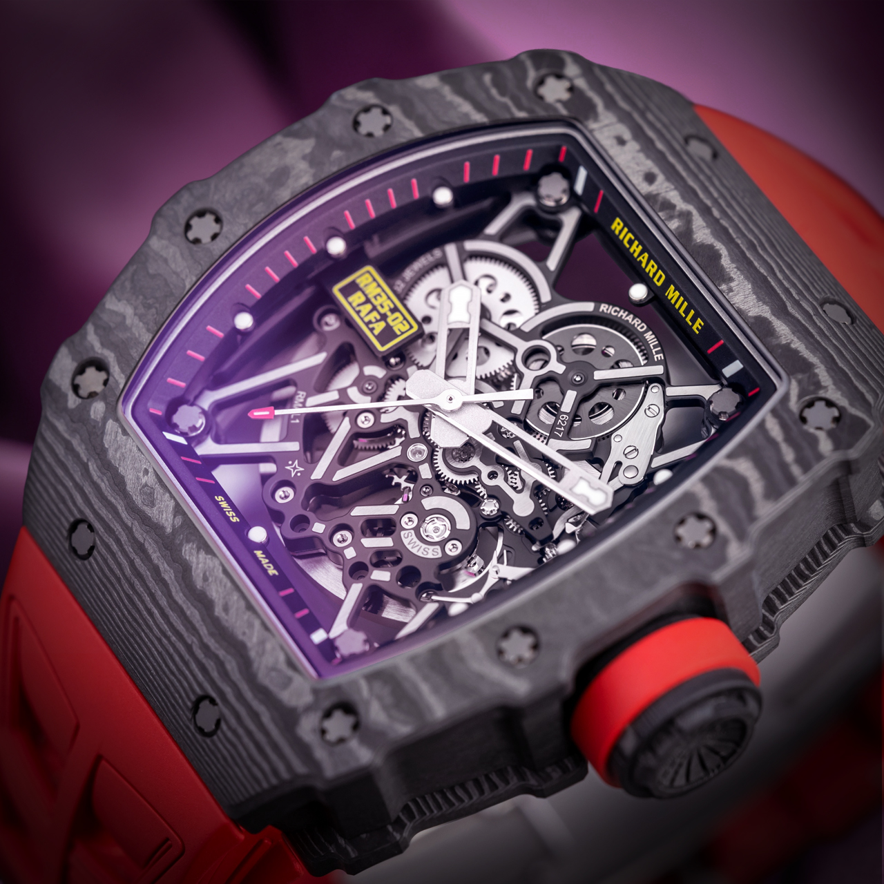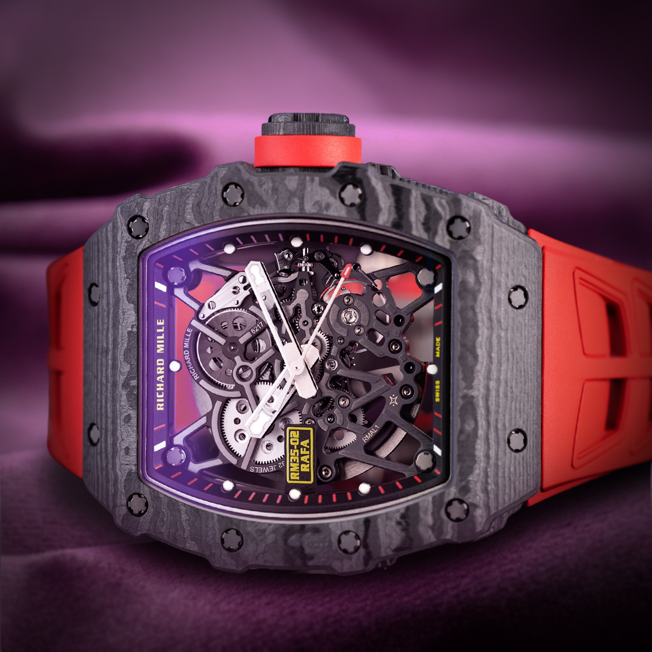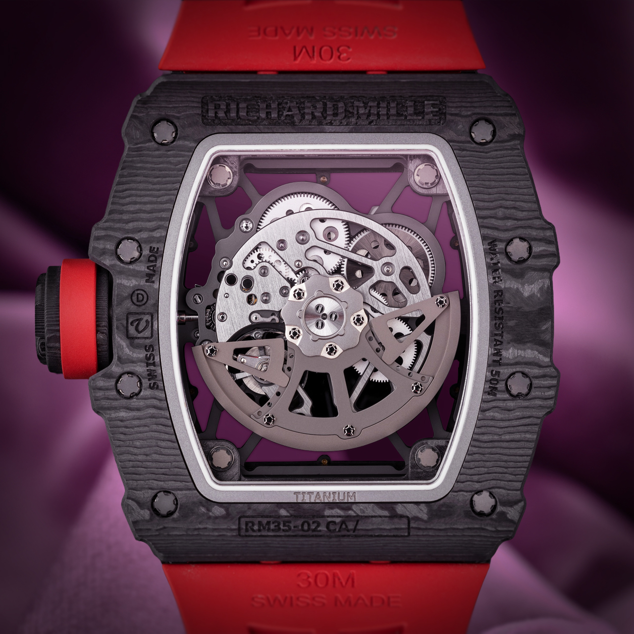 Introducing the Richard Mille RM 35-02 Rafael Nadal, a dynamic fusion of performance and style. This timepiece features a lightweight TPT carbon case, known for its strength and durability. The striking skeletonized dial showcases vibrant red and yellow accents, enhancing its sporty aesthetic while providing clear visibility of the intricate movement. Designed in collaboration with tennis champion Rafael Nadal, this watch includes a unique automatic movement that offers a power reserve of approximately 55 hours. The red rubber strap pairs exceptionally with the graphite TPT carbon, and ensures a secure and comfortable fit, making it ideal for both sports and casual wear. Elevate your collection with the Richard Mille RM 35-02 Rafael Nadal, where cutting-edge technology meets iconic design. |