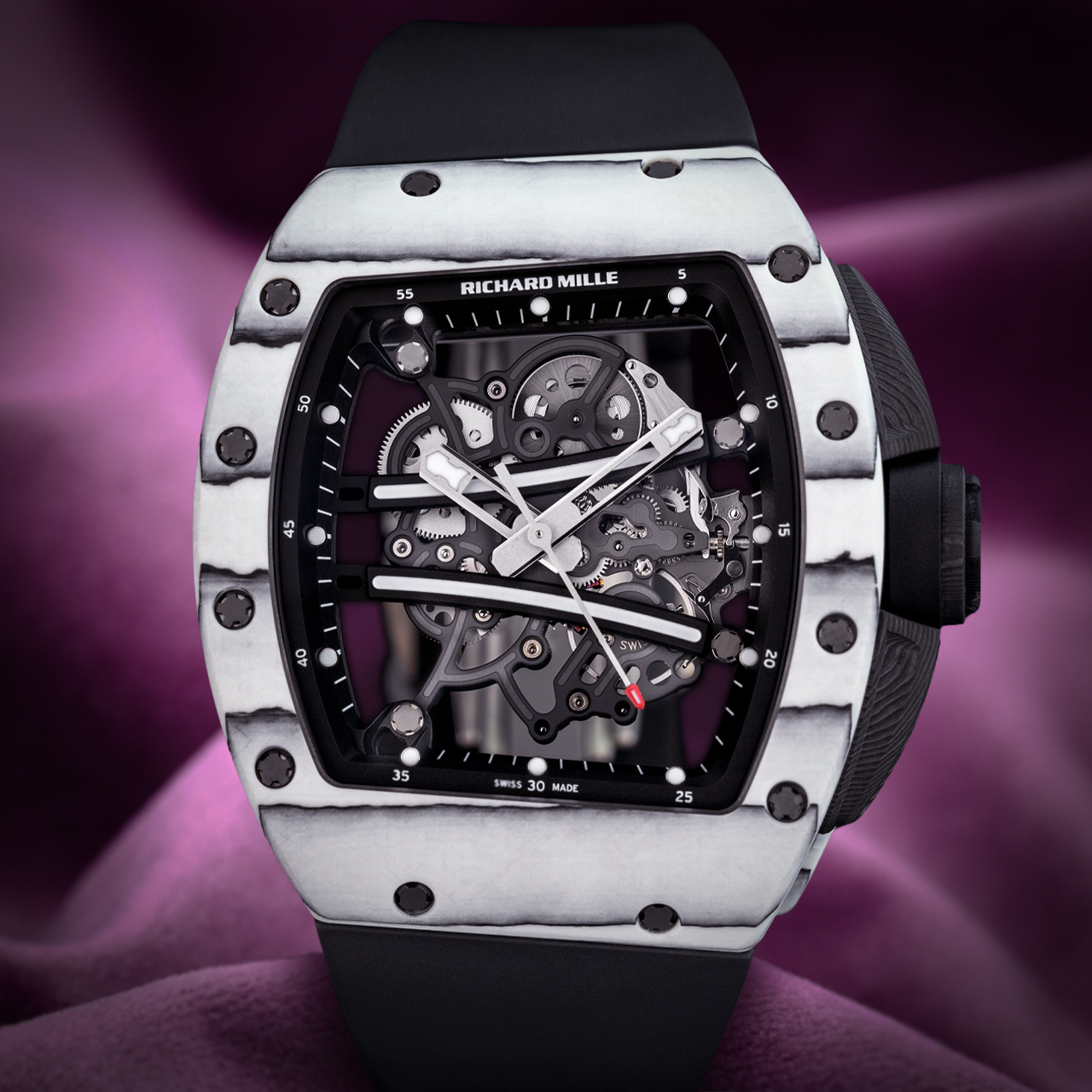 Introducing the Richard Mille RM 61-01 Yohan Blake Ultimate Edition, a striking timepiece crafted from lightweight white carbon. This innovative material not only enhances durability but also adds a modern touch to the watch’s overall aesthetic.
