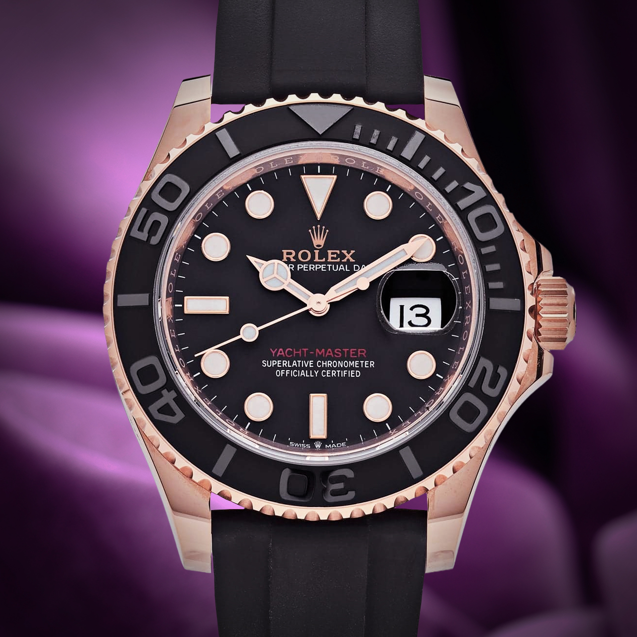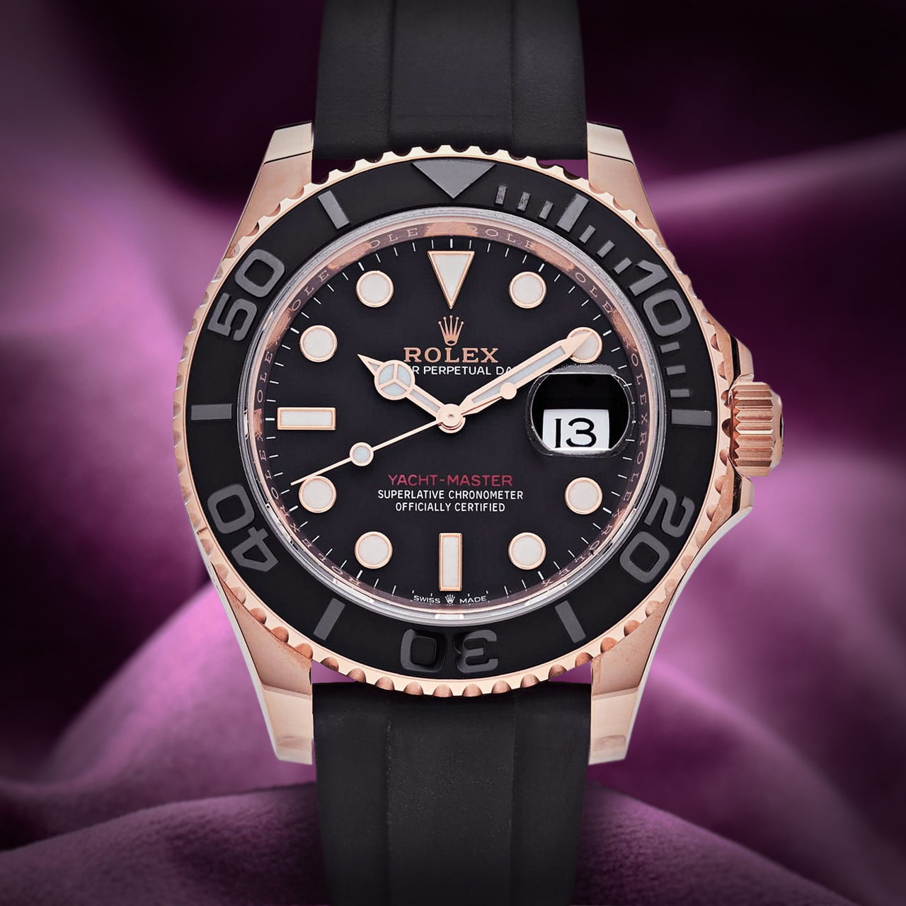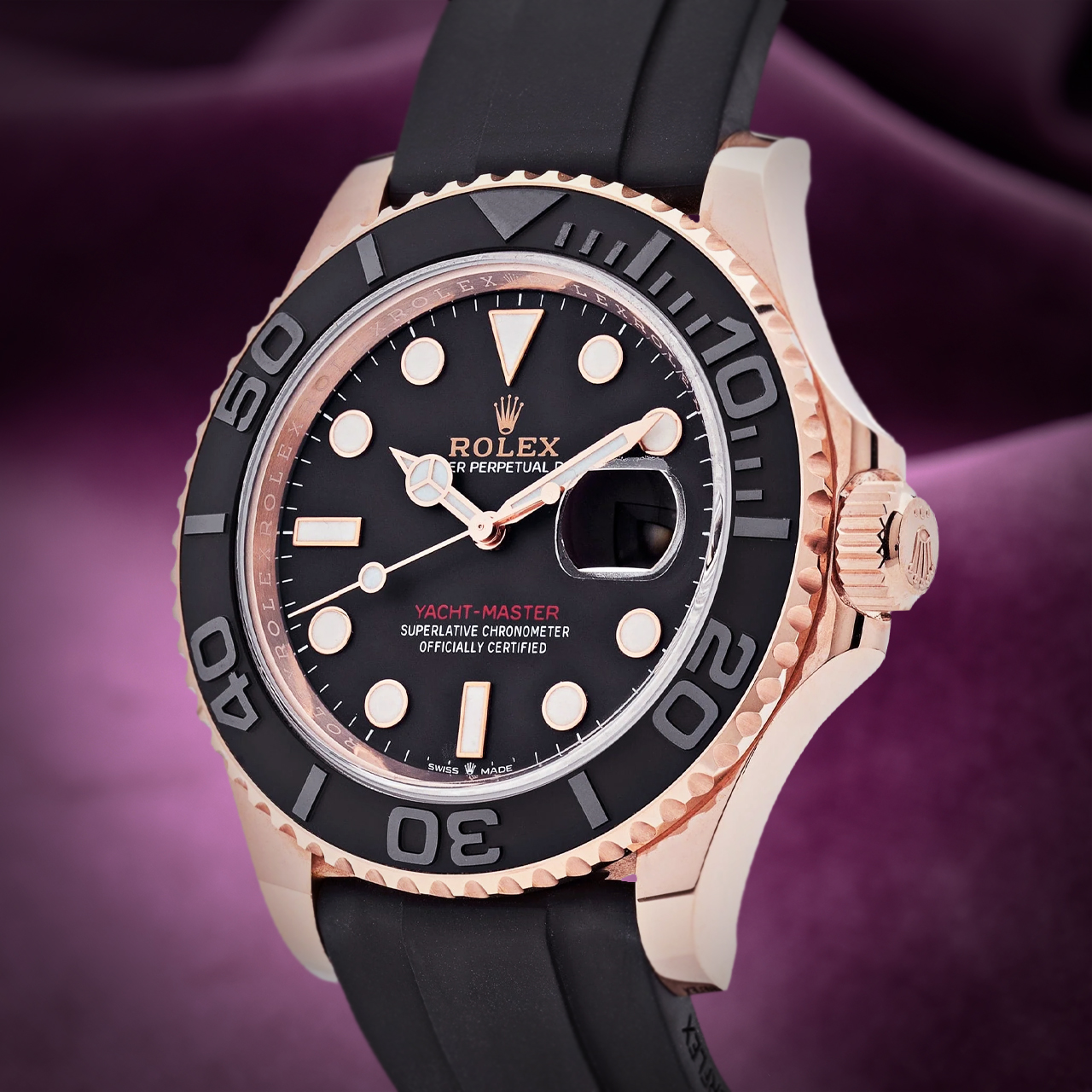 Introducing the Rolex Yacht-Master 126655, a stylish combination of luxury and sport. This watch features a striking black dial, accented by luminous hour markers and hands for clear readability. The 40mm 18k Everose gold case adds a touch of elegance, while the black ceramic bezel offers a modern and sporty edge. The watch is paired with a black Oysterflex band, providing comfort and flexibility with a secure fit. Its design is specifically crafted for nautical adventures while maintaining a refined appearance. The Rolex Yacht-Master 126655 is perfect for those who appreciate a sophisticated yet sporty timepiece, ideal for both on and off the water. |