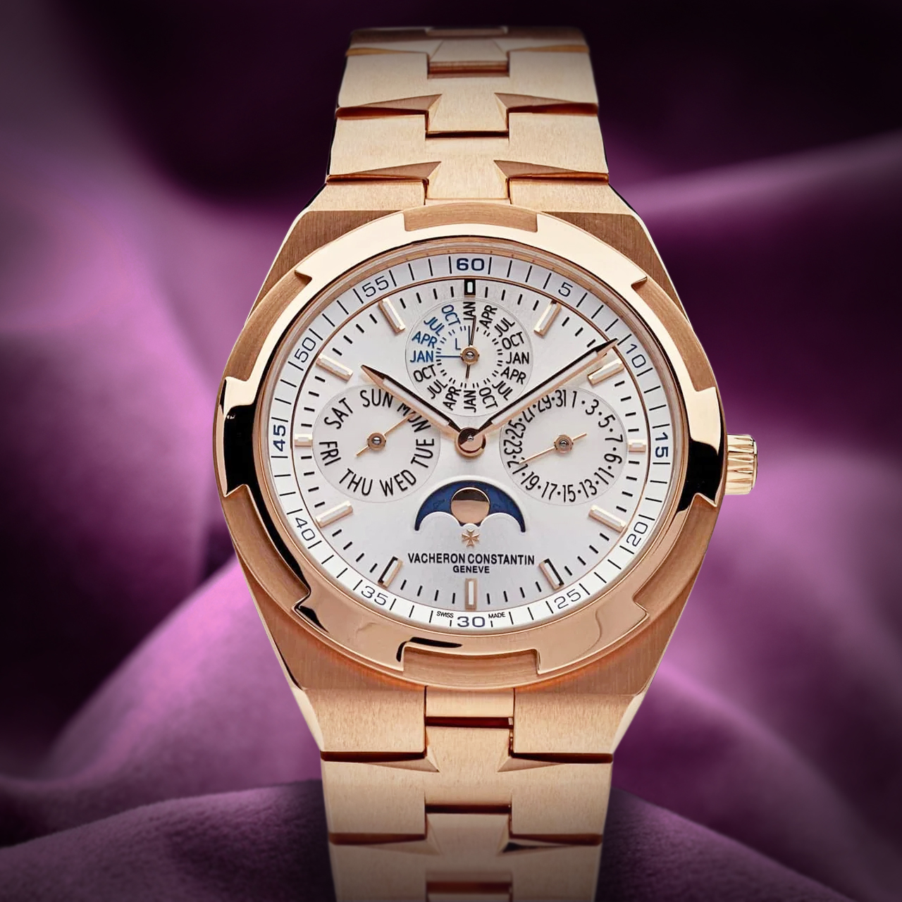 This watch features a refined silver dial with luminous hour markers and hands, ensuring clear readability. The 41.5mm rose gold case offers a luxurious touch, while its ultra-thin profile enhances elegance and comfort. Equipped with a perpetual calendar function, it accurately displays the date, day, and month, showcasing intricate craftsmanship. The watch is complemented by a robust yet stylish rose gold bracelet, ensuring a secure and comfortable fit. The Vacheron Constantin Overseas Perpetual Calendar Ultra-Thin is perfect for those who value exquisite design and high-end functionality in a timeless timepiece. |