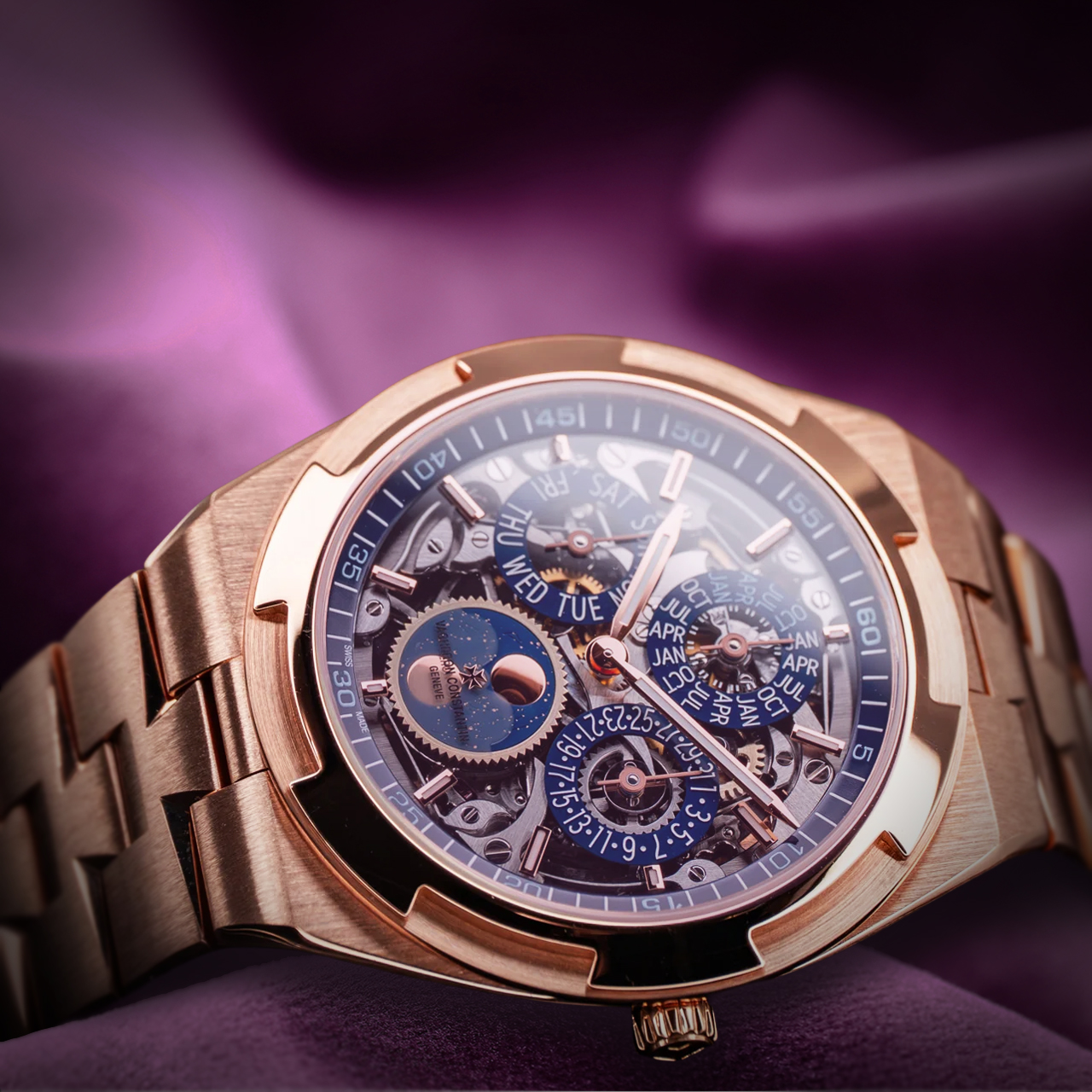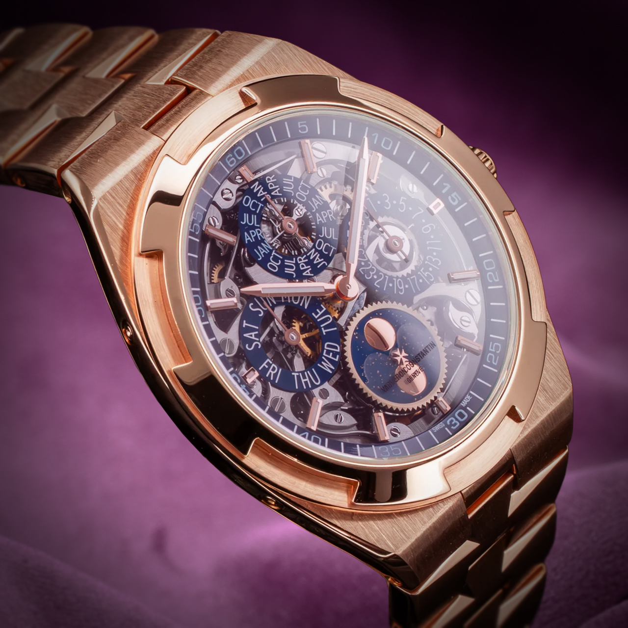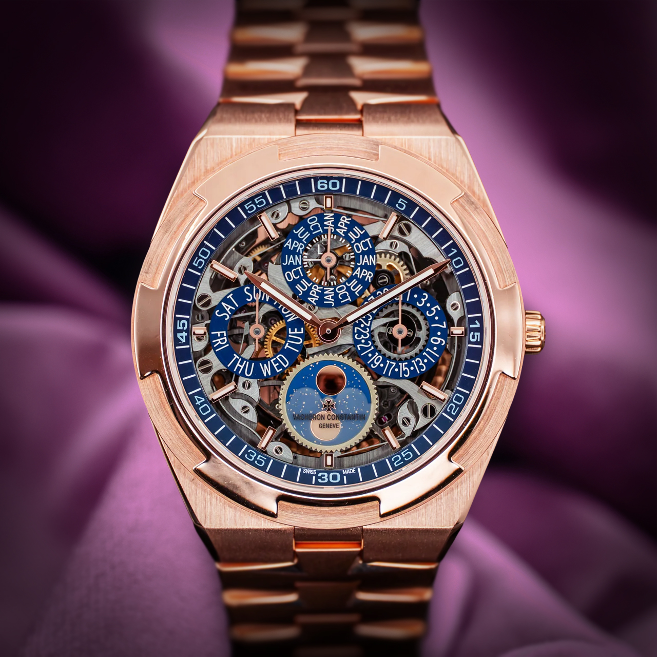 Introducing the Vacheron Constantin Overseas Perpetual Calendar Ultra-Thin Skeleton, a masterpiece of horological engineering and elegant design. This watch features an exquisite 18K rose gold case, showcasing a sophisticated yet sporty aesthetic. The skeletonized dial reveals the intricate mechanics of the perpetual calendar movement, with beautifully crafted hour markers and hands for optimal readability. The watch includes functions for date, day, month, and leap year, seamlessly integrated into its design. Powered by the ultra-thin 1120 QP/1 movement, it provides exceptional precision and a power reserve of approximately 40 hours. The watch is completed with a comfortable and stylish rose gold bracelet, offering a secure fit for both formal and casual occasions. Elevate your collection with the Vacheron Constantin Overseas Perpetual Calendar Ultra-Thin Skeleton, where luxury meets exceptional craftsmanship. |